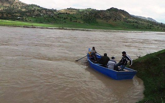 مشهد: قارب خشبي يعبر سد الوحدة عند اورتزاغ شهر مارس 2017