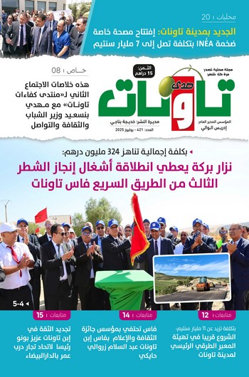 مكتب الرباط:”تاونات نت”/-صدر مؤخرا العدد 421 (يوليوز2025) من مجلة “صدى تاونات” الورقية، والذي تضمن مجموعة من المواد الإخبارية والأنباء على رأسها الحدث المهم المتعلق ب”بكلفة إجمالية تناهز 324 مليون درهم:نزار بركة يعطي انطلاقة أشغال إنجاز الشطر الثالث من الطريق السريع فاس تاونات ” وخبرا بارزا يهم: برئاسة وزير الفلاحة أحمد البواري:إطلاق مشروع بسهل سايس بحضور رئيس الغرفة الفلاحية الجهوية ابن تاونات مصطفى الميسوري“وتغطية إخبارية بعنوان “الجديد بمدينة تاونات: إفتتاح مصحة خاصة ضخمة INÉA بتكلفة تصل إلى 7 مليار سنتيم”.