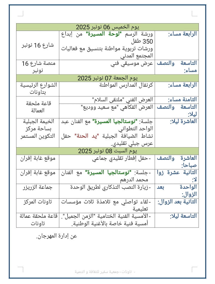 كما ستشكل هذه الدورة فرصة متميزة ونادرة لعقد جلسات تواصلية داخل المؤسسات التعليمية ينشطونها الفنانون والفنانات بغية تقريب التلاميذ والتلميذات من معرفة تاريخ المسيرة الخضراء المظفرة بصفة عامة، ومغزى القرار الأممي الصادر بتاريخ 31 أكتوبر 2025 بصفة خاصة.