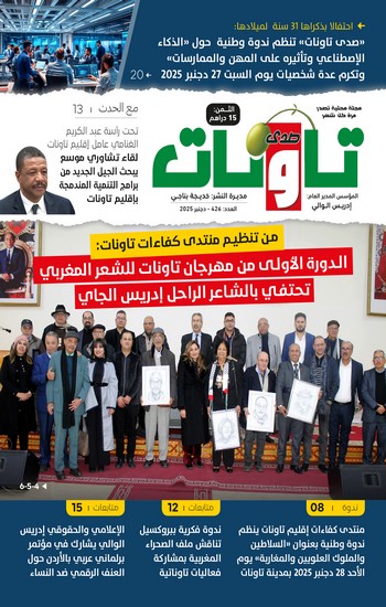 كما تضمن العدد كذلك تغطية ل” انتخاب البرلماني المغربي (إبن تاونات) سعيد شاكر ممثلا للاتحاد البرلماني الإفريقي لشمال إفريقيا” وتغطية ل” ندوة فكرية ببروكسيل تناقش ملف الصحراء المغربية بمشاركة فعاليات تاوناتية” و” منتدى كفاءات إقليم تاونات ينظم ندوة وطنية بعنوان “السلاطين والملوك العلويون والمغاربة“ وذلك يوم الأحد 28 دجنبر 2025 مدينة تاونات”.