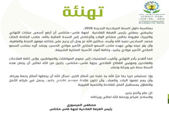 كما أتقدم بأحر التهاني وأطيب المتمنيات إلى عموم المواطنات والمواطنين، وإلى كافة الفلاحات والفلاحين ومهنيي القطاع الفلاحي بجهة فاس–مكناس، راجين من الله تعالى أن يجعل هذه السنة سنة خير وبركة ونماء.