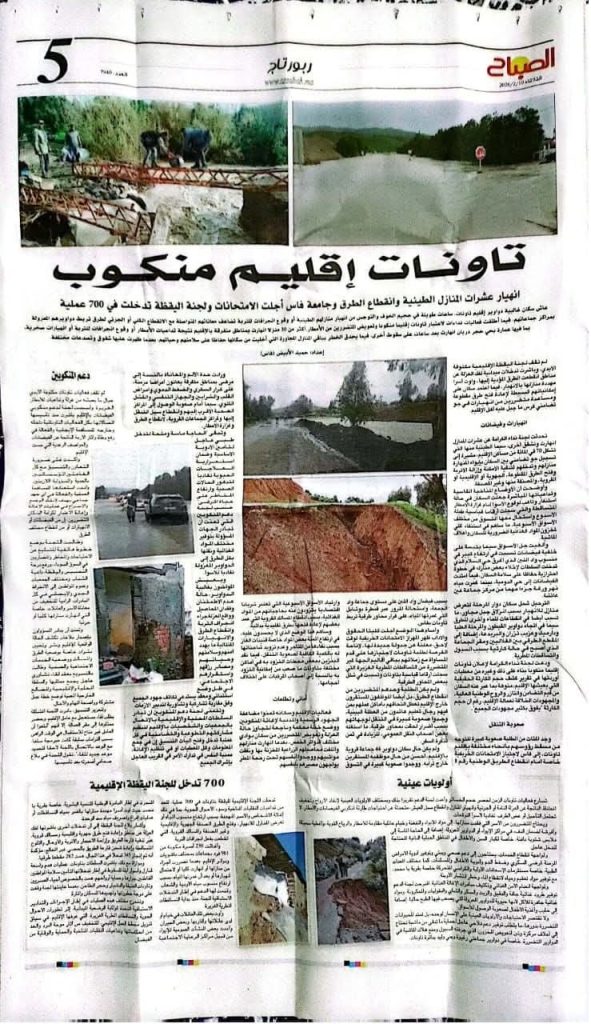 توفيق الحياني:”تاونات نت”//- على إثر التصريح الذي أدلى به مؤخرا السيد نزار بركة، وزير التجهيز والماء، والذي أرجع فيه عدم إدراج إقليم تاونات ضمن لائحة المناطق المنكوبة إلى عدم استيفاء المعيار الزمني المحدد في 504 ساعات، المنصوص عليه في القانون 110.14 المؤطر لصندوق التضامن ضد الوقائع الكارثية، فإن لجنة دعم منكوبي فيضانات إقليم تاونات تعبر للرأي العام الوطني عن ما يلي: