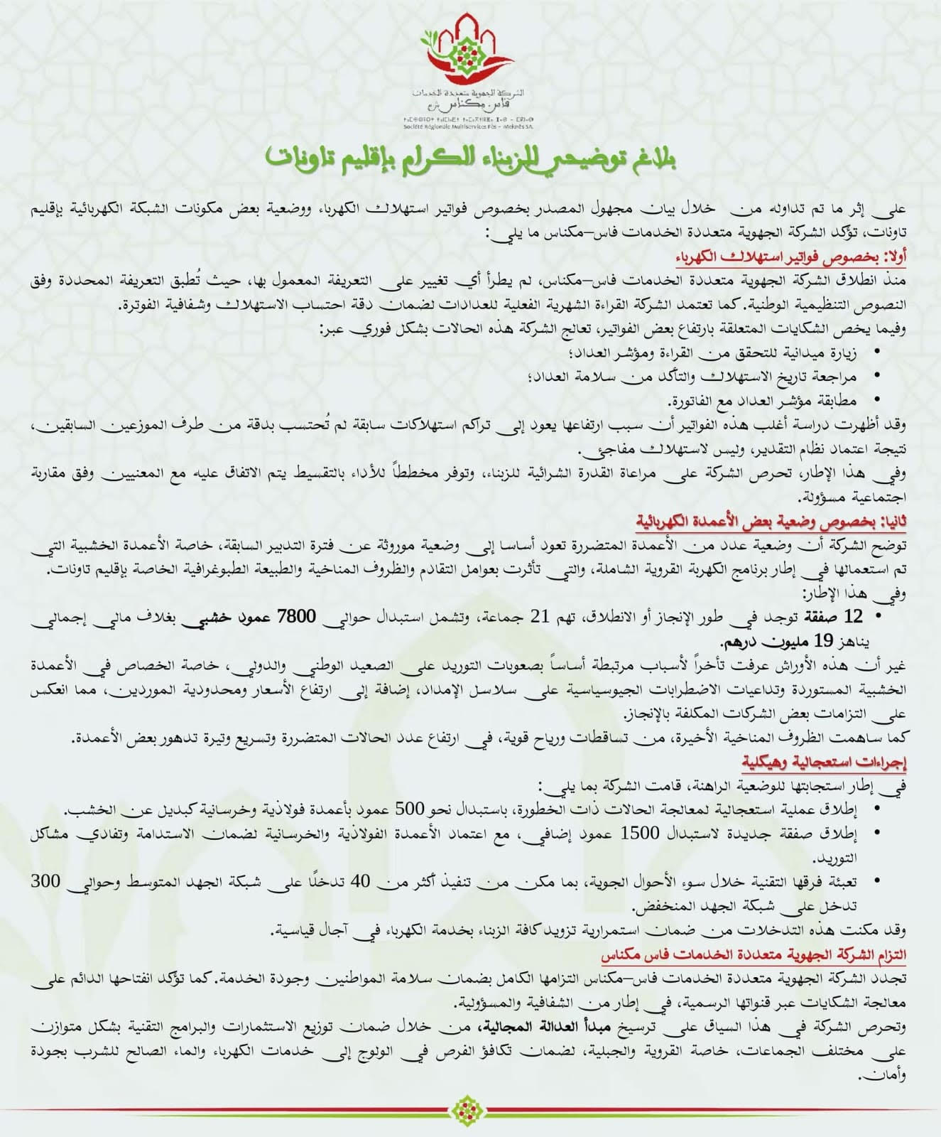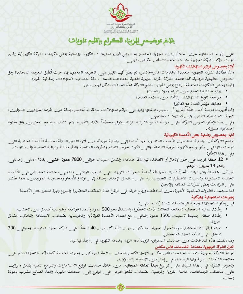 شركة الخدمات فاس مكناس تصدر بلاغا توضح فيه ما يتعلق بفواتير استهلاك الكهرباء بتاونات